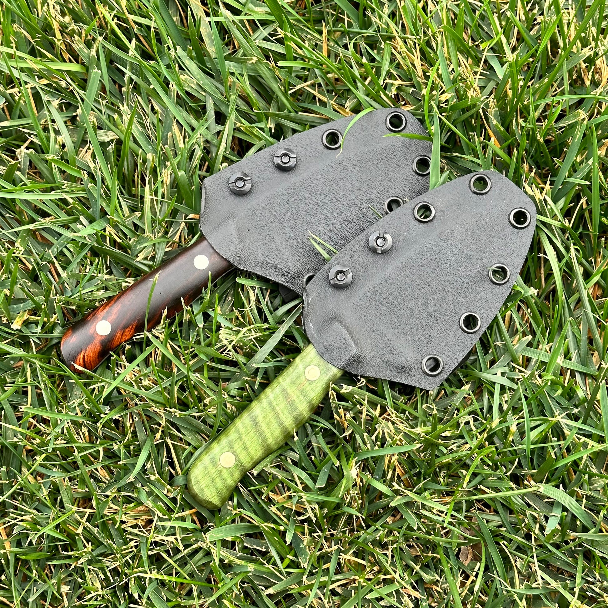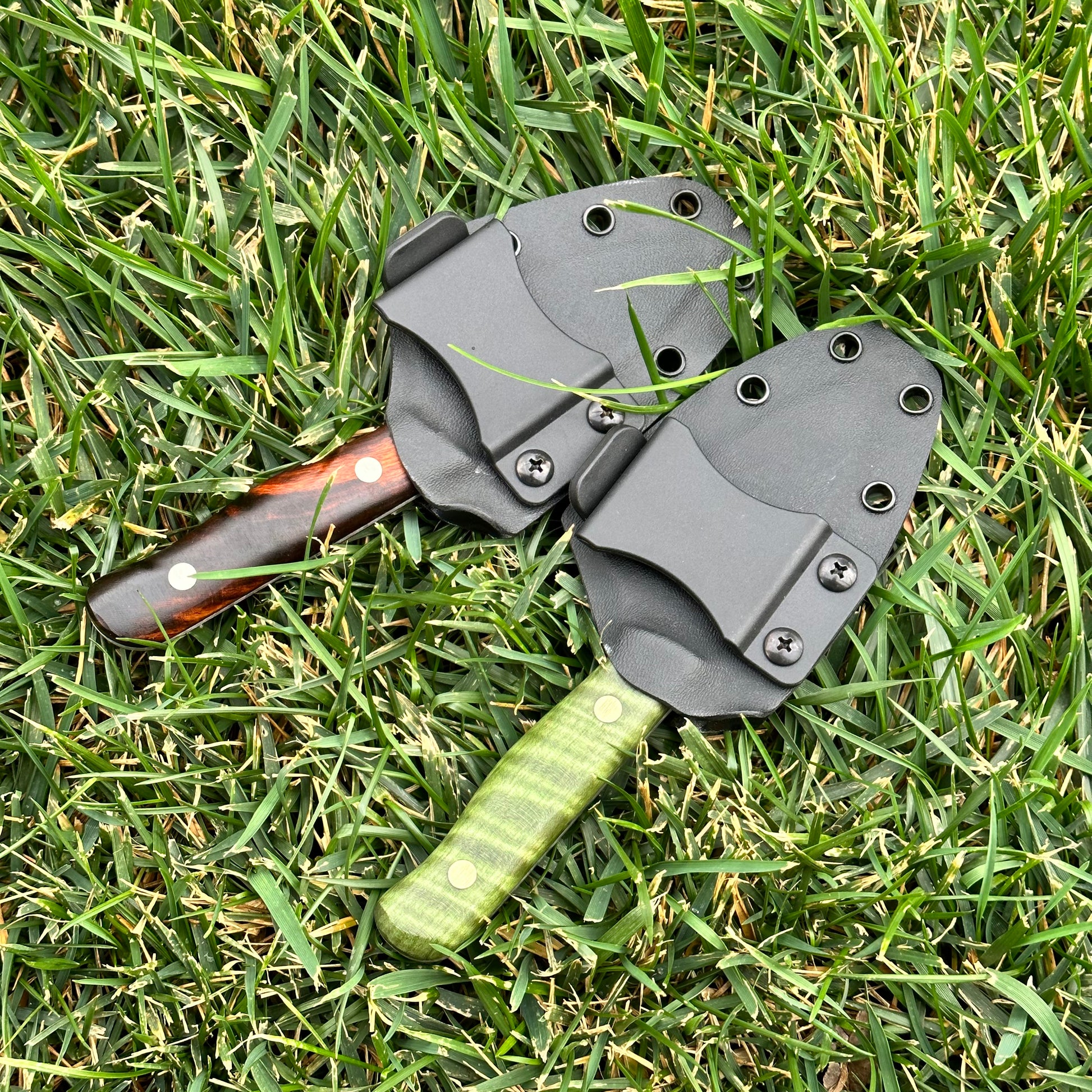 This pair custom skinners is a variation of one of our most requested knives and each features a horizontal carry kydex sheath for a rugged, stylish, and function carry whether you are using it in the field, or everyday..