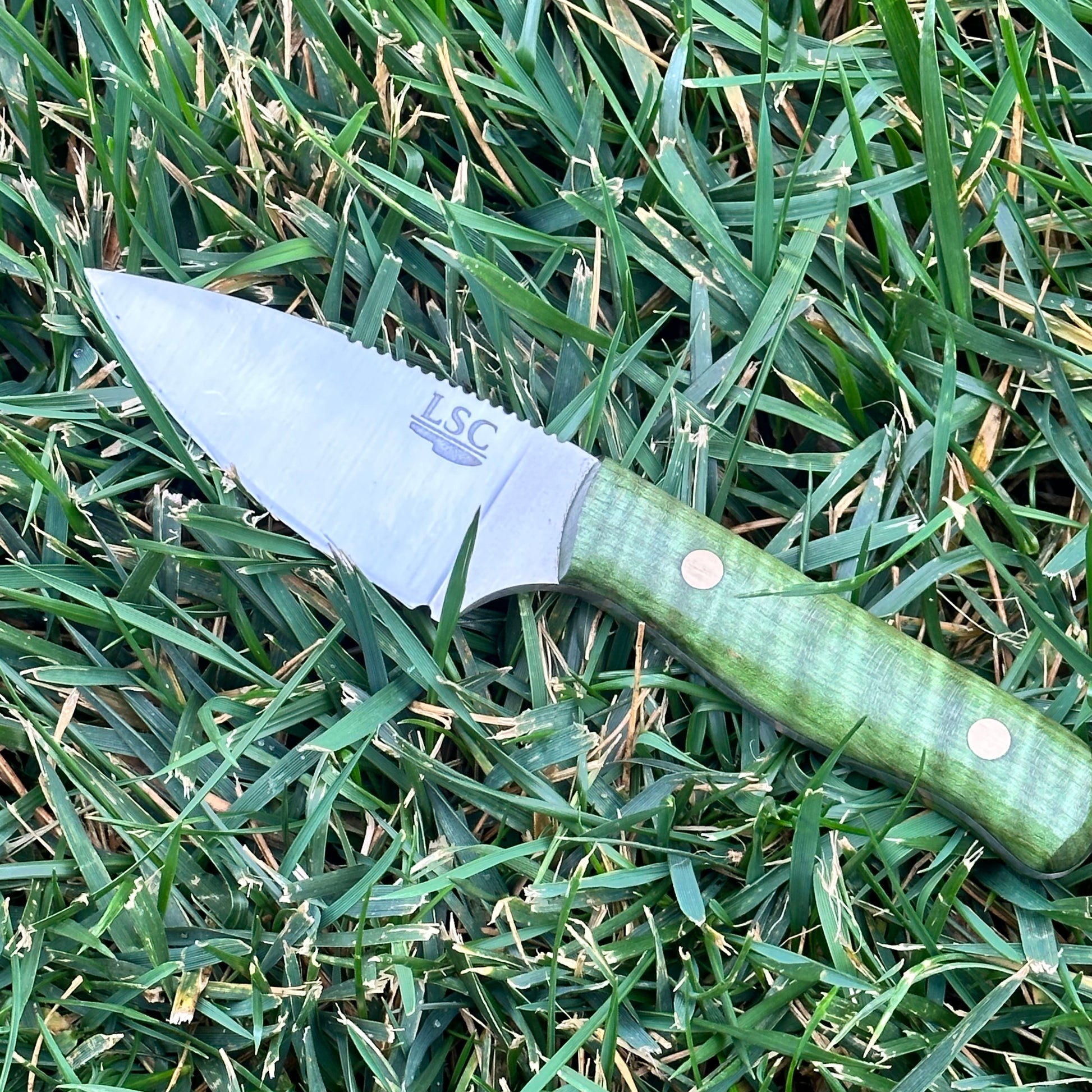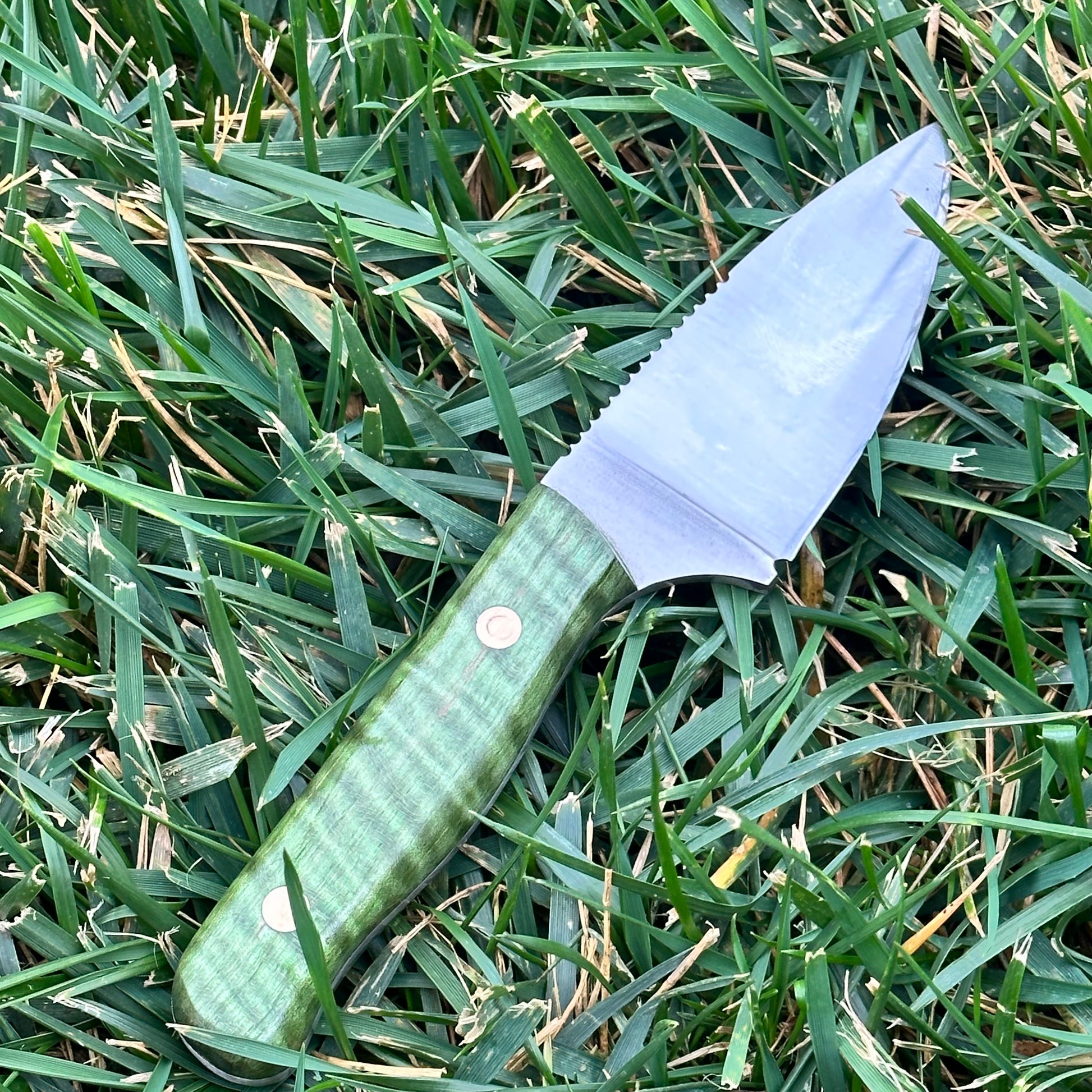 Handle: Green Dyed Stabilized Curly Maple w/ Brass Pins
