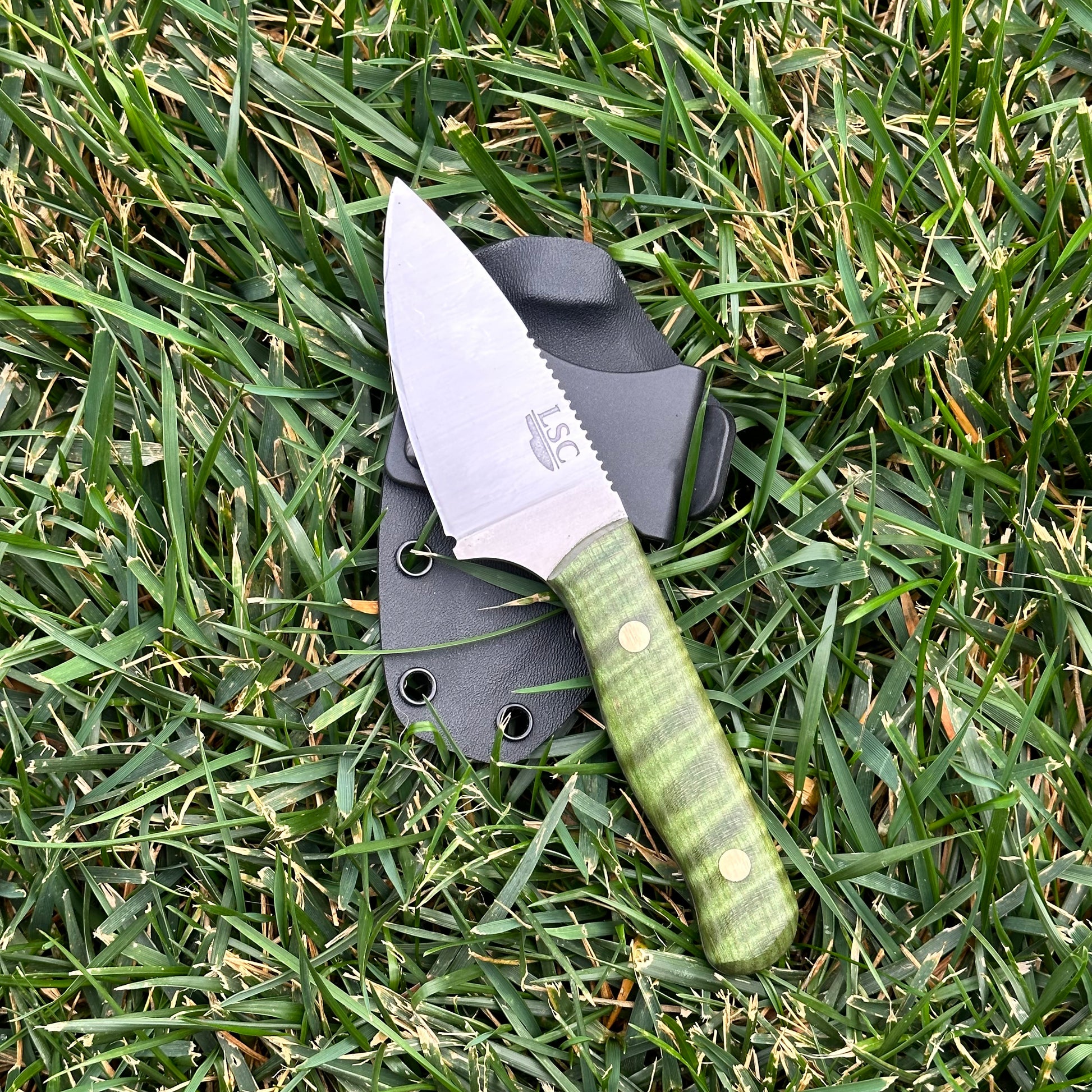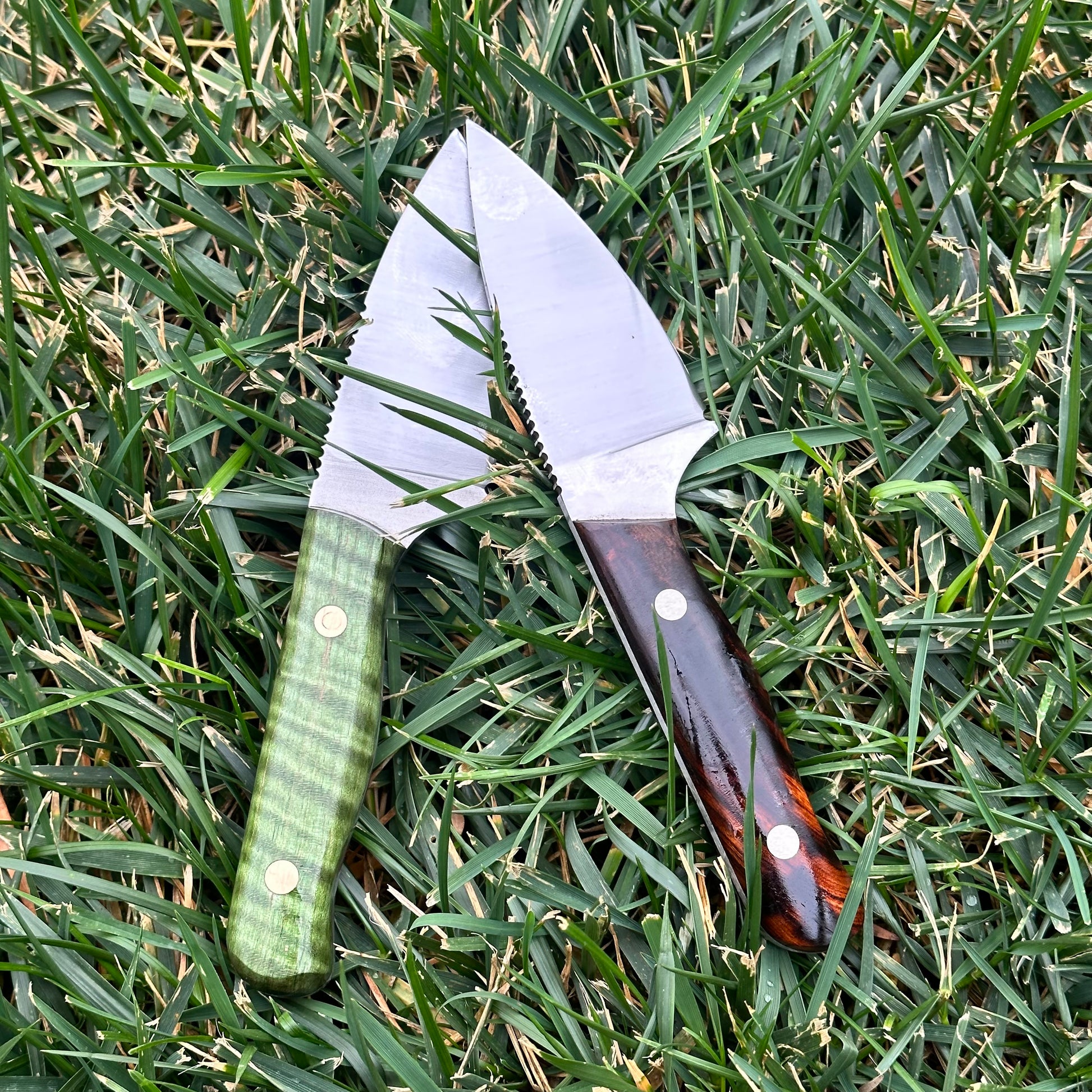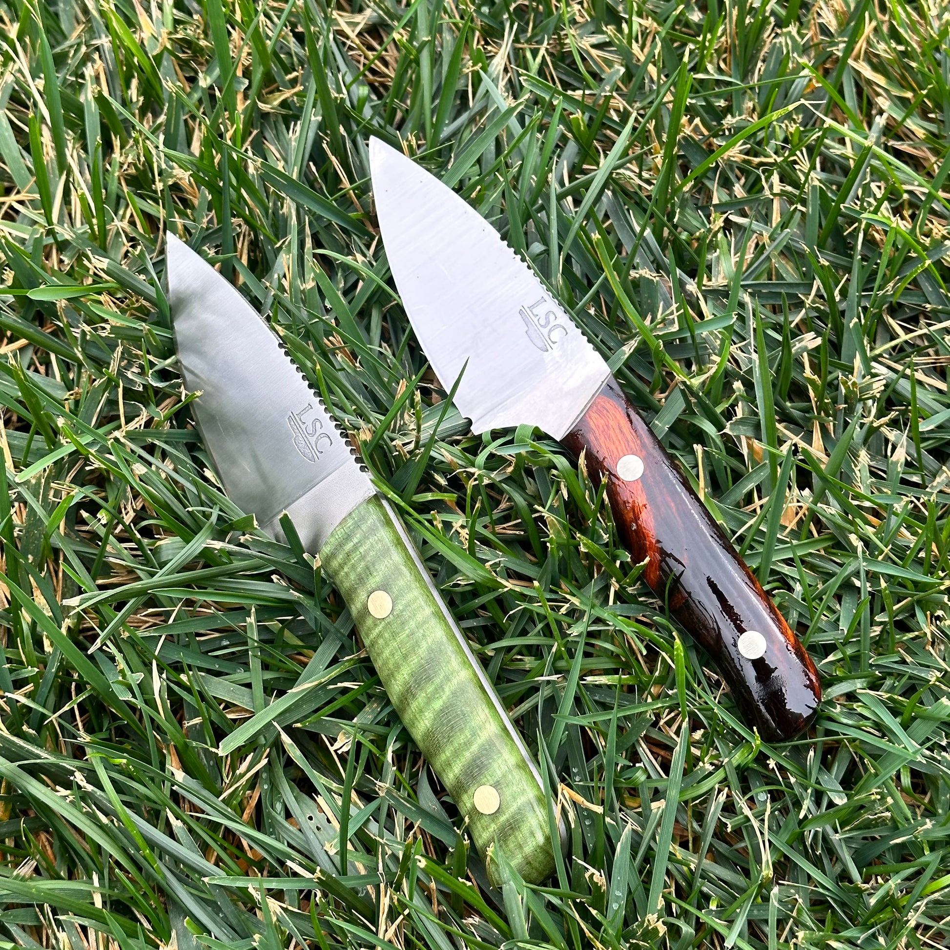 The blades are cut from AEB-L Stainless and hardened to 61 HRC, one knife is finished with a stabilized green dyed curly maple handle construction that is set off with brass corby style pins for a unique yet classic look while still retaining good durability. The second knife is finished in Arizona Ironwood and finished with Nickel Silver corby style pins. Weighing in at under 4 ounces each of these lightweight knife will have no problem breaking down big game in the field and is ready for years of service.