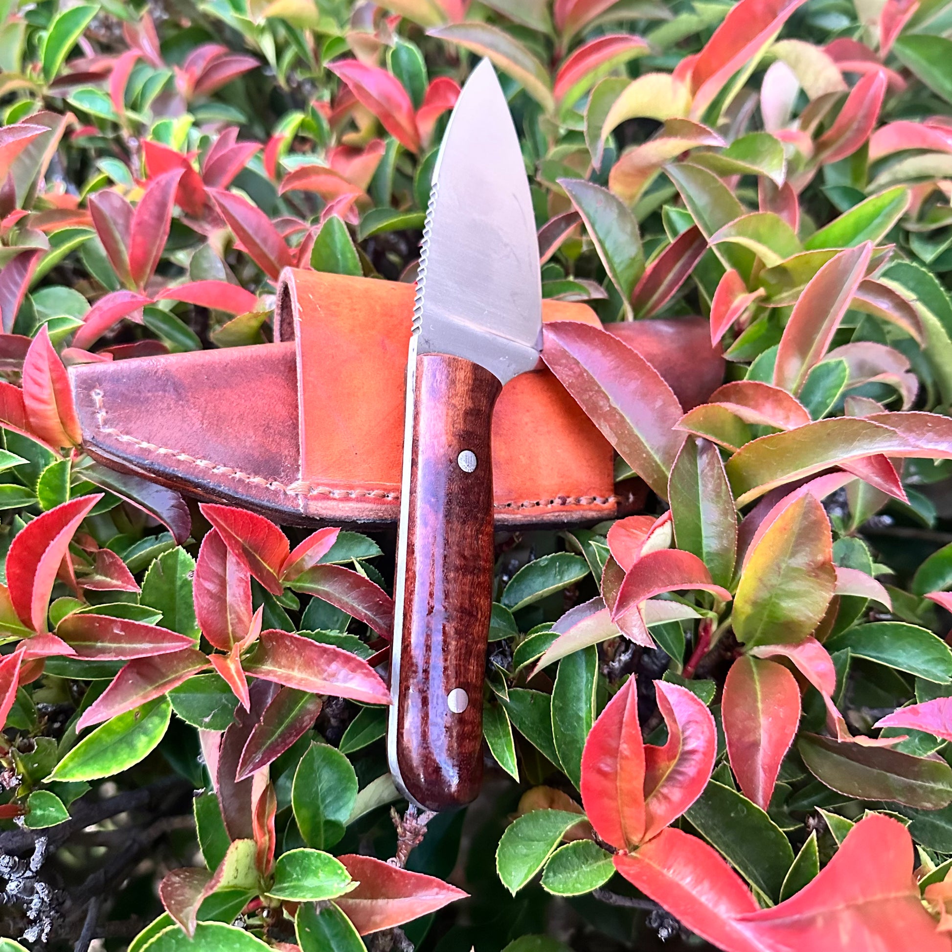 This custom skinner is a variation of one of our most requested knives and features a one off horizontal carry leather sheath made from died 4-5oz vegetable tanned leather and hand stitched for a rugged, yet rustic finish that will patina beautifully and age gracefully.