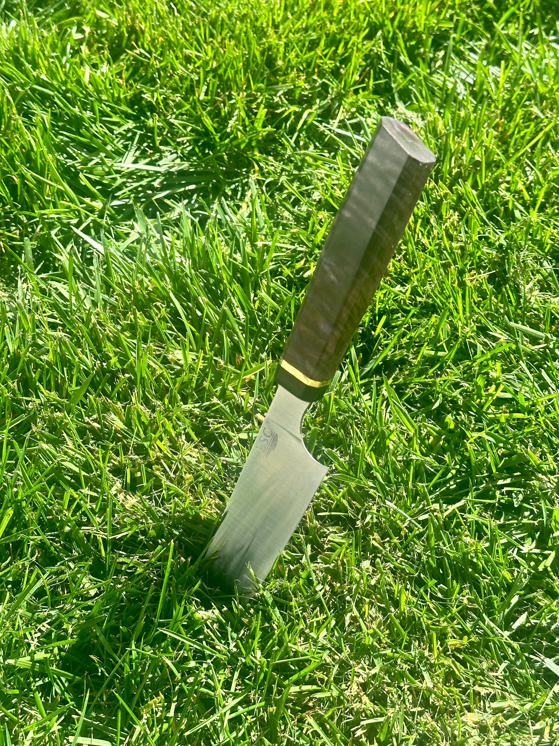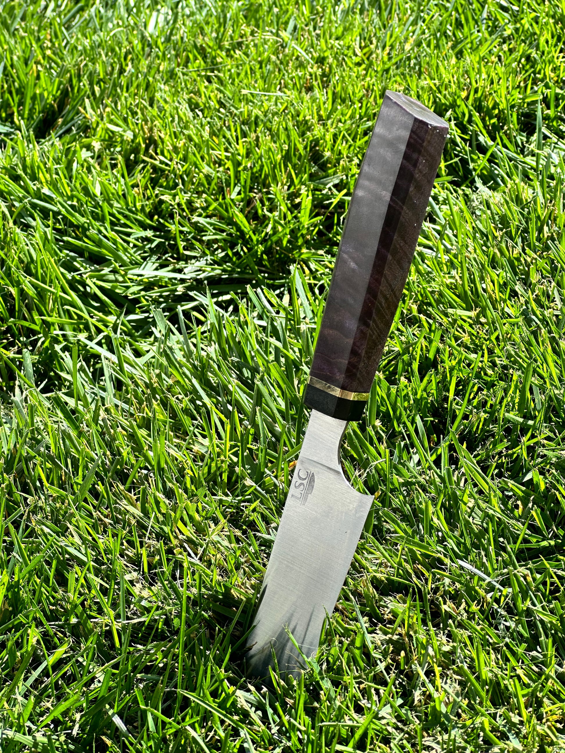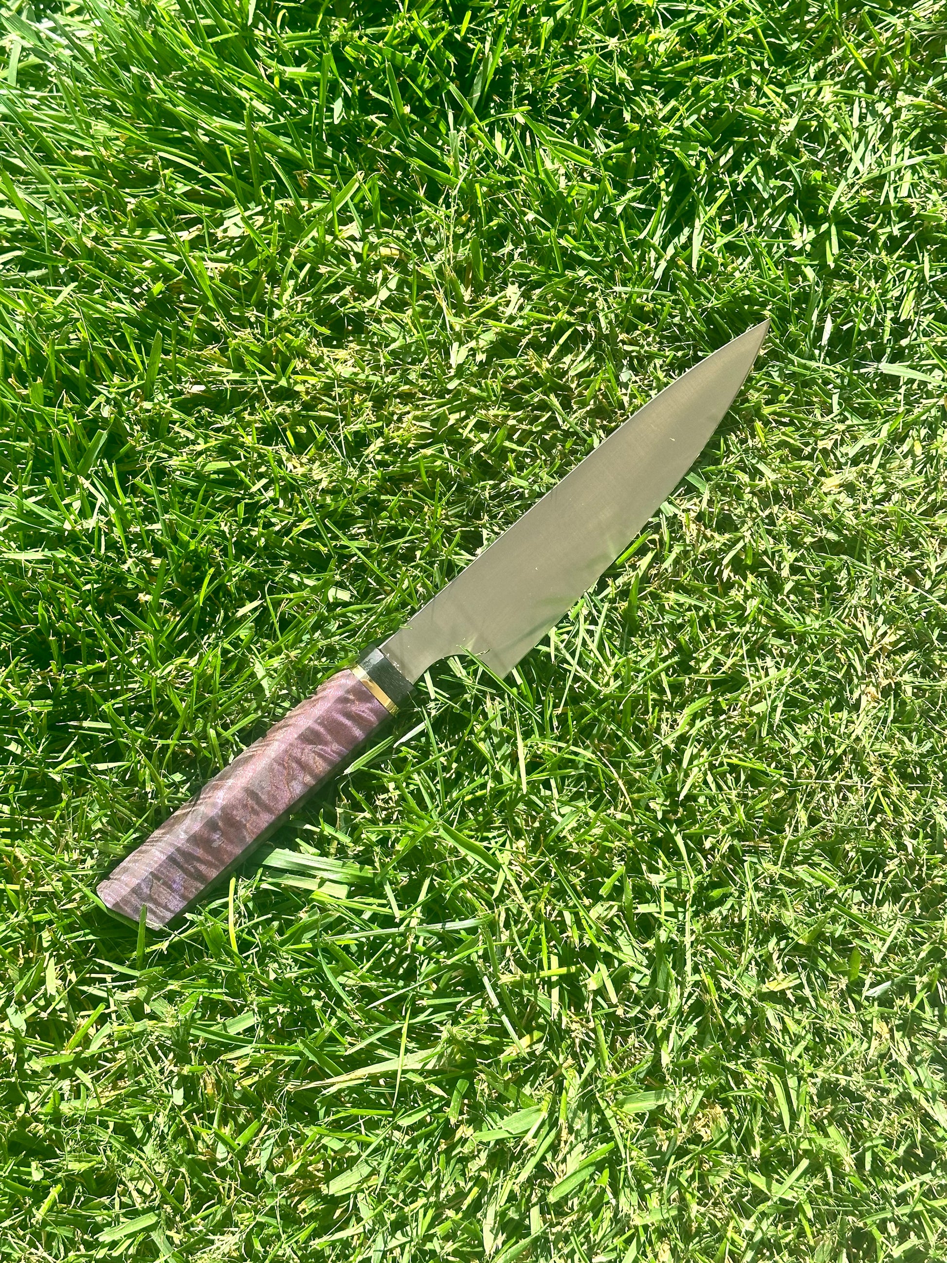The blade is cut from AEB-L Stainless and hardened to 61 HRC. It is finished with a Stabilized and Dyed Purple Curly Maple hidden tang handle capped with brass and ebony blackwood construction giving a unique yet classic look that draws inspiration from classic Japanese cutlery. Featuring a full flat geometry backed by a slim .080" spine, this knife is extra slicey. Vegetables run in fear when this knife leaves the drawer.