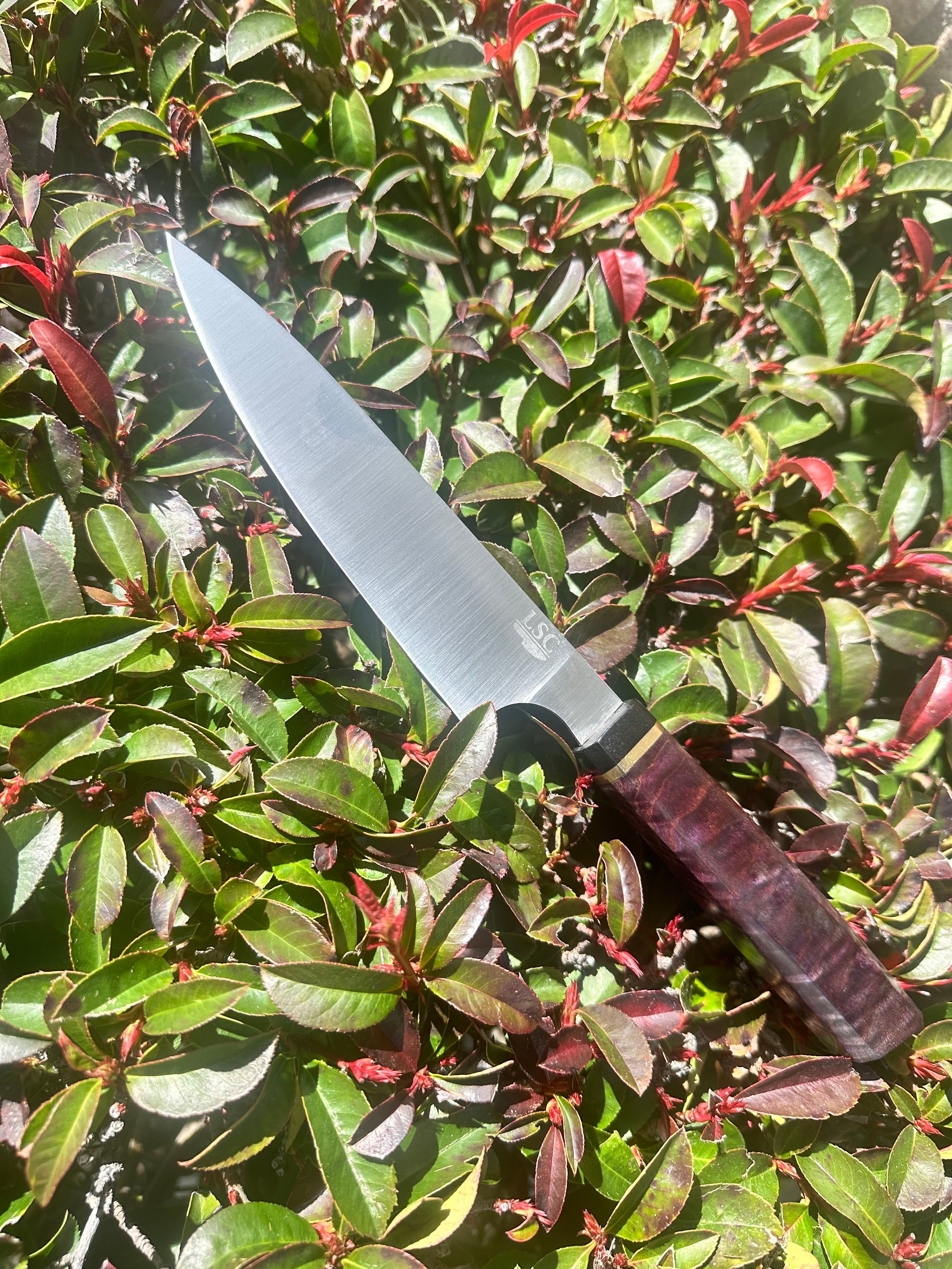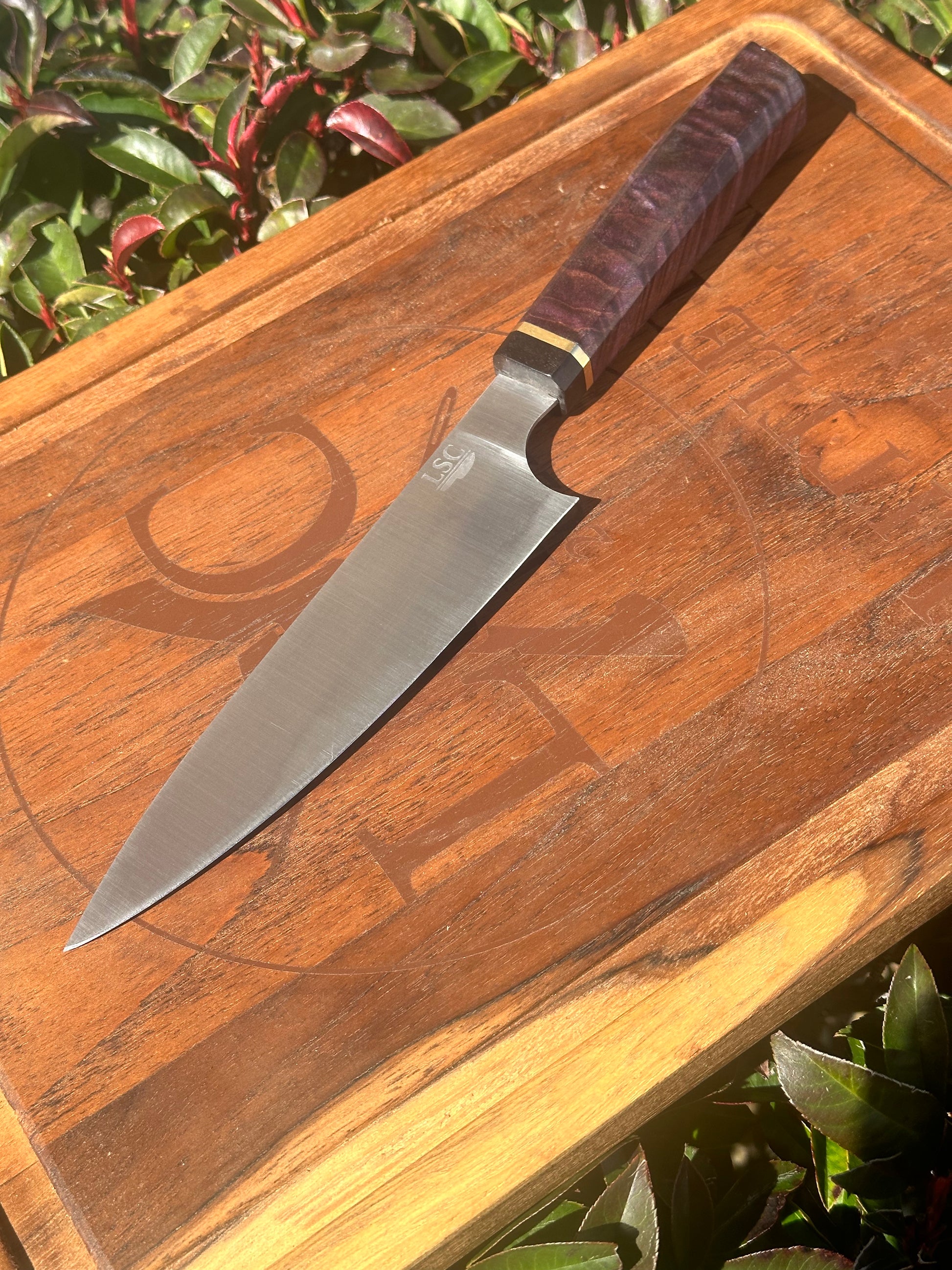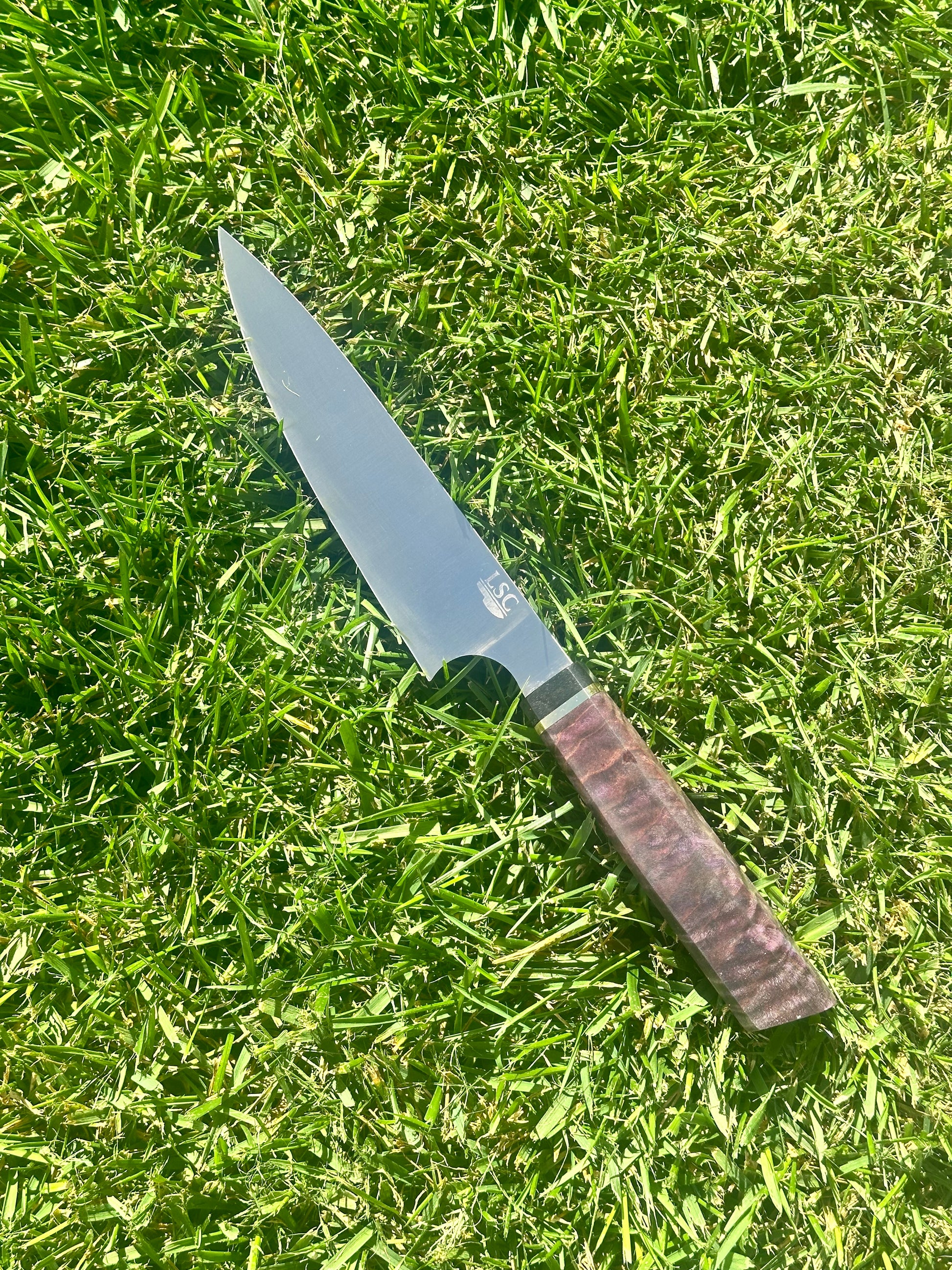 The blade is cut from AEB-L Stainless and hardened to 61 HRC. It is finished with a Stabilized and Dyed Purple Curly Maple hidden tang handle capped with brass and ebony blackwood construction giving a unique yet classic look that draws inspiration from classic Japanese cutlery. Featuring a full flat geometry backed by a slim .080" spine, this knife is extra slicey. Vegetables run in fear when this knife leaves the drawer.